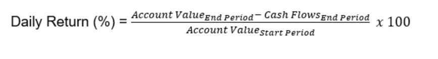 The Daily Percentage Return reflects both realised profits (from closing positions) and unrealised gains (from price changes in open positions). It also incorporates capital gains and costs, including fees, dividends, coupon payments, and other corporate action distributions.