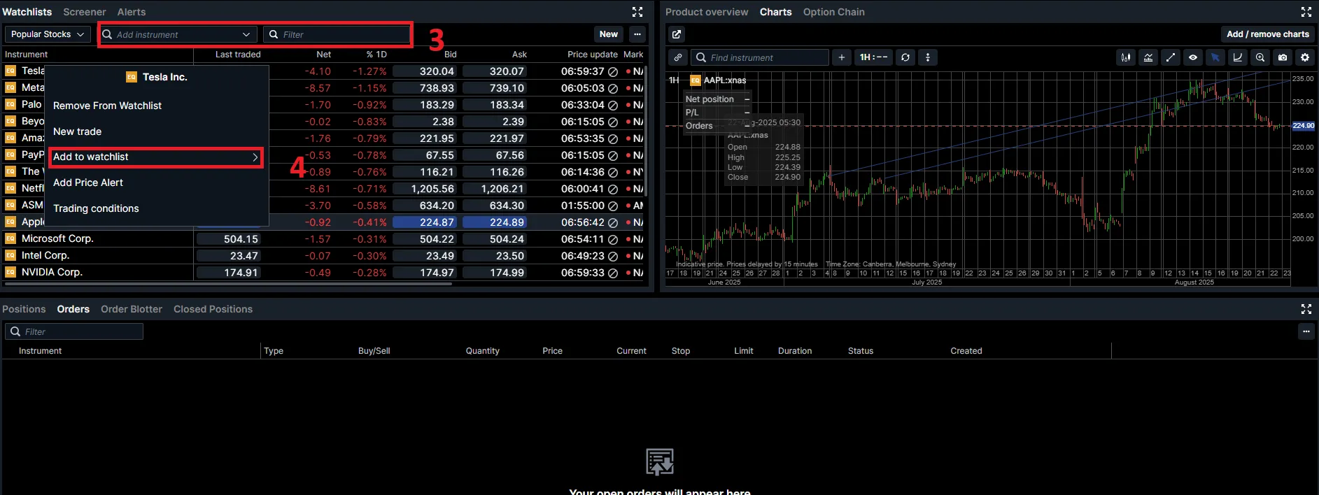 Use the search bar to type the name or symbol of the instruments you want to monitor or trade.(e.g. stocks, forex pairs, commodities).