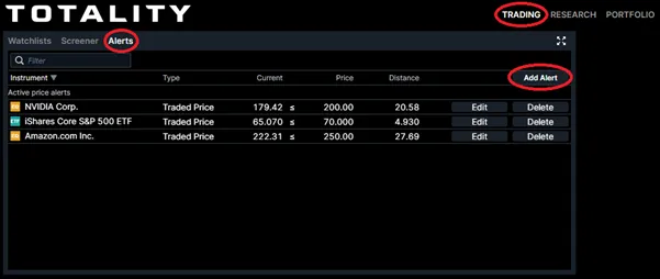 To add a price alert please see the below example on Totality Edge: