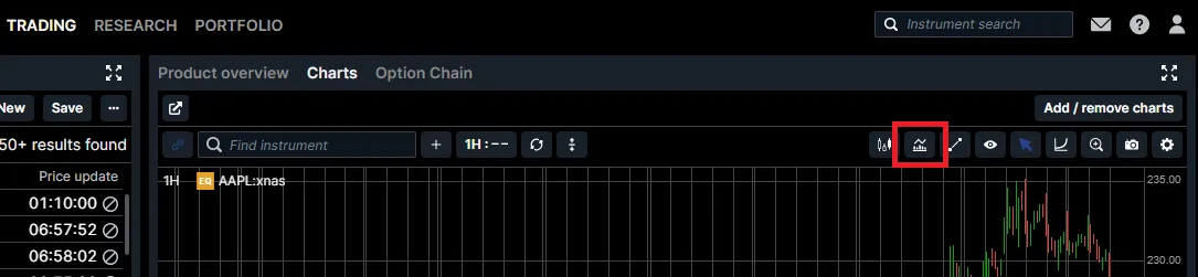 When viewing an advanced chart, you’ll find a range of tools located in the top-right corner of the chart window. To apply technical indicators: