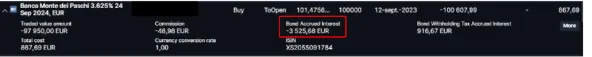 When buying bonds, you pay the Market value, Accrued interest and Trade fees when opening a trade.