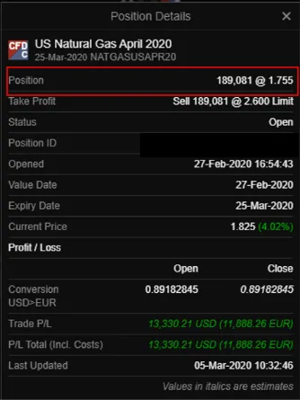 When entering a CFD (Contract for Difference) trade, you will either buy or sell the particular product you are trading. The price at which you enter the market is the gross traded entry price. As shown in the screenshot below, a US Natural Gas position of 189,091 was entered at a gross traded entry price of USD 1.755.