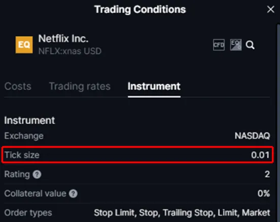 You can view the tick size of a specific instrument by navigating to the trading conditions > Click Instrument > See Tick size