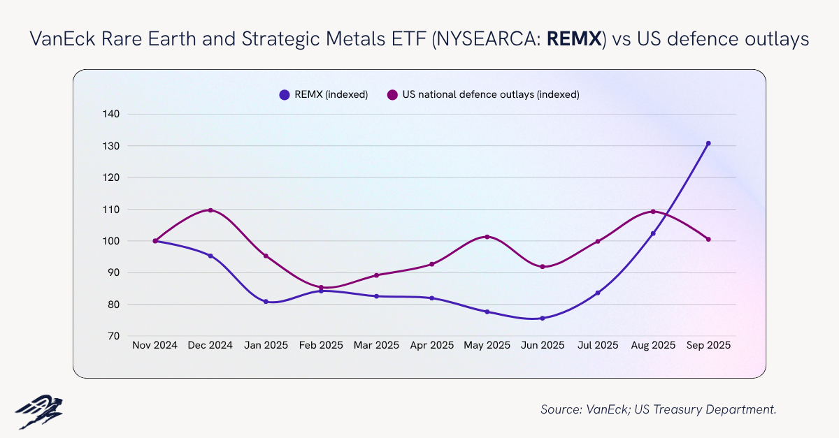 To illustrate this, look at the relationship between REMX, made up of rare earth equities, and US defence outlays (chart above). While not perfectly correlated, the “pull-forward premiums” in REMX broadly tracked the multi-quarter step-up in US defence procurement.